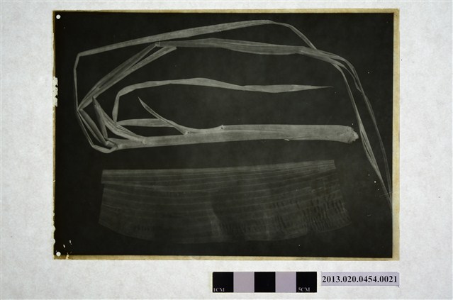 1.底片影像拍攝主題為甘蔗病害紀錄,影像中有一束對半折曲的蔗葉,該蔗葉因染病而生長不良,葉片細小而枯萎,底片下方另有一長方形狀的葉片,有大小不一的駁斑。2..底片有印記「FUJI FILM」沒有 SAFETY字樣,表示是硝酸纖維片,不是安全軟片。邊緣有缺角記號,代表底片的種類與感光速度。一般來說富士軟片用半圓形缺角為記號,柯達軟片使用三角形缺為記號。二個缺角代表感光度為100度,三個缺角代表感光度為400度。3.甘蔗有葉燒病、葉枯病、白條病等等十多種常見病害,甘蔗病害會導致甘蔗產量減少、造成含糖量大幅降低,直接影響經濟效益。4.臺灣氣候適合甘蔗生長,自17世紀的荷蘭統治時期起,臺灣便大量種植甘蔗為原料來生產蔗糖,作為臺灣主要的出口商品,故甘蔗為早期臺灣最重要的經濟作物之一,直到1960年代食糖出口比重降低,臺灣逐漸從昔日的出口地區轉變為進口地區。