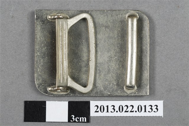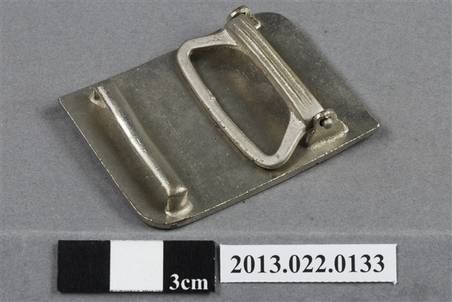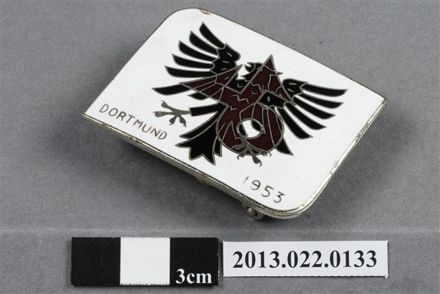 1.本件皮帶環扣為銀色金屬製品,呈長方形,表面為珐瑯材質,底色為白色,中間印有一隻黑色的老鷹圖騰,老鷹上方覆蓋一個紅色圈形交叉符號,老鷹圖騰的左下方及右下方分別寫有「DOUTMUND」及「1953」字樣。2.德國Doutmund市的圖章為一隻展翅的黑色老鷹圖騰,該市於1953年主辦國際大學運動會(International University Games),推測本件皮帶環扣為當時的紀念品。