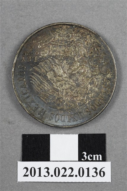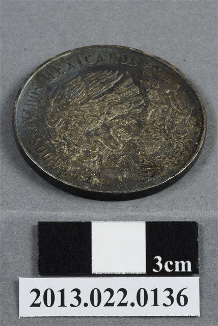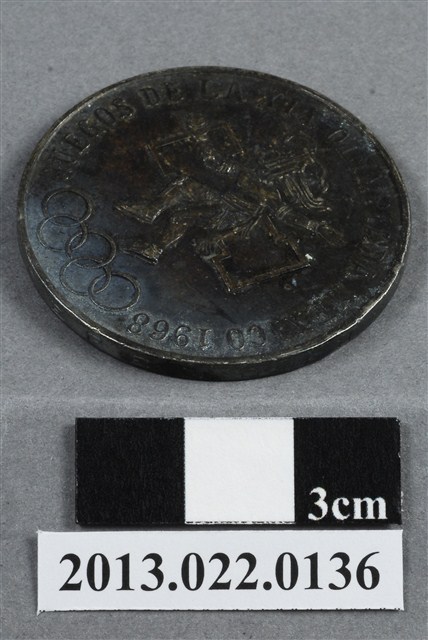 1. 第19屆夏季奧運墨西哥紀念幣為壓鑄法製成,呈扁平的圓形,直徑約3公分左右,雙面刻有圖文,厚度適中。紀念幣以浮雕、陽刻技法為主。正反面皆有些許磨損和刮痕,尤其正面下方有大片鏽蝕痕跡,背面則有變色現象。紀念幣正反面皆留有一圈弦紋,向內剔地後再於其上浮雕出圖案。一面中央浮雕一身著阿茲特克傳統服飾、一手握著球的中美洲蹴球選手,背面浮雕出呈「I」字型的球場,選手下方浮雕出奧運五環圖示。周圍有一圈文字:「JUEGOS DE LA XIX OLIMPIAD A MEXICO 1968」,意思即為1968年在墨西哥舉辦的第19屆夏季奧運。紀念幣另一側中央浮雕一隻老鷹,嘴巴銜一條蛇,腳踩於仙人掌盆栽上,盆栽下方另有植物紋飾。這個圖像是墨西哥的建城傳說,亦是墨西哥國旗上方的圖騰。上方文字,由左至右書:「ESTADOS UNIDOS MEXICANOS」,即是墨西哥合眾國。此為面值25披索的紀念幣,如左下方所示:「25」、「PESOS」;右下方另刻有含銀量等成分認證:「LEY 0.720 MO」。2. 這是1968年墨西哥為奧運發行的紀念幣,但並未流通於市面上。本屆奧運亦是臺灣以「台灣」為隊名參賽,表現亮眼的選手有女田徑選手紀政,奪得80公尺跨欄銅牌,是臺灣女性運動員首度奪牌,也是首位東亞女性奪牌。