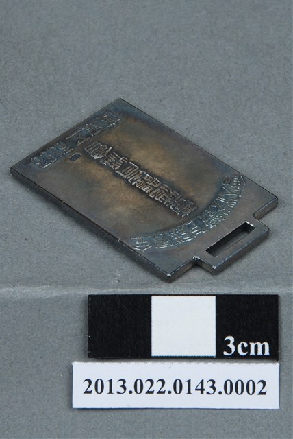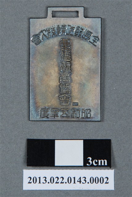 1. 昭和五年全島陸上競技大會紀念章為壓鑄法製成,呈扁平的長方形,雙面,上方有一馬蹄形孔洞,可穿繩做懸掛之用。獎牌以浮雕、陽刻技法為主。獎牌整體保存完整,但正反兩面皆有明顯的氧化痕跡,略微變色。獎牌正面浮雕數個交疊的橢圓形,橢圓形內高浮雕不同的圖像,分別表示不同運動項目,如田徑、棒球、籃球等。獎牌右側則有一株植物,右上角浮雕英文字母「VICTORY」。紀念章背面以陽刻文字為主,上至下、左至右書:「全島陸上競技大會」、「臺灣體育協會」、「昭和五年度」。昭和五年即1930年,獎牌上為當時臺灣體育協會舉辦賽事後給參賽者的參賽紀念章。2. 臺灣體育協會於1920年成立,是日治時期臺灣最具規模的體育運動組織。臺灣體育協會在各項運動競賽的制度上與日本接軌,互動十分緊密。協會透過州廳制度發展,並陸續於各行政區域成立各地支部。協會目的在於「提倡體育運動,以謀國民身體之健全與精神之充實」,主辦了各項運動比賽,包含大型賽事的選手預選會、臺灣本島的各項競技大會等。隨著組織發展,將臺灣體育協會的規模制度逐步創建完整,其中包含每年必須舉辦全島的各式競賽活動,如田徑大會、棒球大會等。