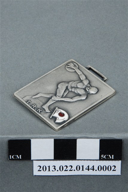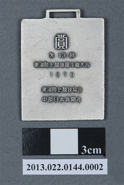 1. 第13回東海陸上競技選手權大會紀念獎牌為壓鑄法製成,呈扁平的長方形,雙面,上方有一凸起的長方形環,應為懸掛作用。獎牌以浮雕、陽刻技法為主。獎牌正反面皆有些許磨損和刮痕,整體保存良好、完整。獎牌正面浮雕一人像,以古希臘雕塑作品《擲鐵餅者》為靈感,高浮雕手執鐵餅的全裸人像。人像頭髮鬈曲,深目高鼻,體格健壯厚實,浮雕著重於肌肉紋理的刻畫,但並未仔細處理細節。臉部、手指以及腳掌處的刻畫略顯不足,但整體姿態生動,比例適中。男子站於一平台上方,平台側面雕有「T.R.K.」字樣,右側則有一飄揚的日本國旗旗幟,旗幟上色。獎牌背面則陽刻筆畫纖細的文字,由左至右、上至下書:「賞」、「第13回」、「東海陸上競技選手權大會」、「1970」、「東海陸上競技協會」、「中部日本新聞社」。2. 東海是日本區域劃分之一地帶,包含愛知縣在內,因此東海陸上競技選手權大會便是在日本愛知縣名古屋舉辦的田徑賽事,為區域型的運動賽事。第13回舉辦於1970年,如獎牌上所示。本組作品為張星賢先生舊藏,張星賢曾在日本早稻田大學留學,並參與兩次奧運,退役後提拔了許多優秀的臺灣田徑選手。而張星賢先生與名古屋中京大學的關係十分友好密切,因此也將許多臺灣選手送至中京大學遊學、訓練。