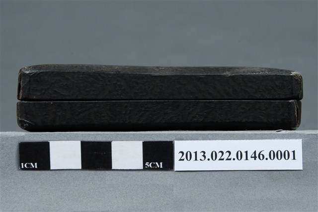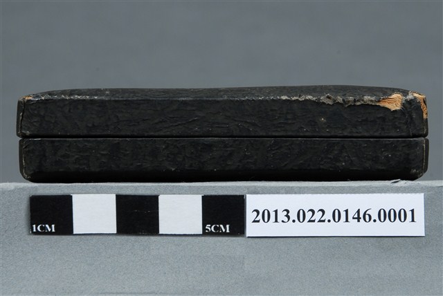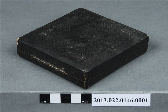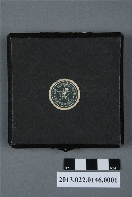 1. 昭和十年南滿洲陸上競技協會記錄章墨色方形盒平面為正方形,呈較扁平的樣式。盒子外觀為深色,帶有皮革紋路。四邊邊緣做切邊,增添裝飾效果。盒面中央印一金色花邊圓形標章,內有一星星圖示,周圍以文字環繞,書:「東京市下谷區御徒町壹丁目六參」、「松井徽章商會謹製」。邊角有多處磨損,露出盒胎。盒子上蓋以掀扣式五金與盒身相連,金屬五金氧化呈深色。盒內上蓋處以米白色緞面布料包覆,可以保護獎牌。盒內鑲嵌淺藍色絨布,並挖出與獎牌大小一致的圓形孔洞,使獎牌可以穩妥收納。布料皆因年久微微泛黃。2. 1932年日本政府在中國東北成立傀儡政權——滿洲國,表面上由清朝末代皇帝溥儀執政,實為日本的殖民地。本件作品的滿洲以及撫順炭鐵,都呼應了當時日本經營滿洲國的歷史。本件作品由張昭平先生捐贈張星賢先生的體育文物,而本件作品對張星賢先生有密切的關聯和回憶。張星賢自早稻田大學畢業後,考取南滿洲鐵道株式會社的職員,並於滿鐵時期參加許多比賽,多次獲得好成績。