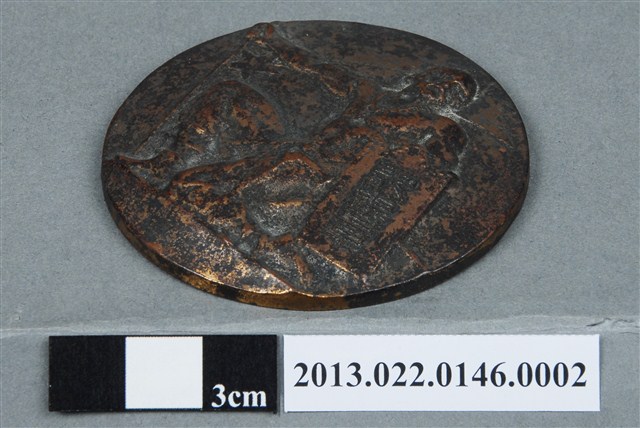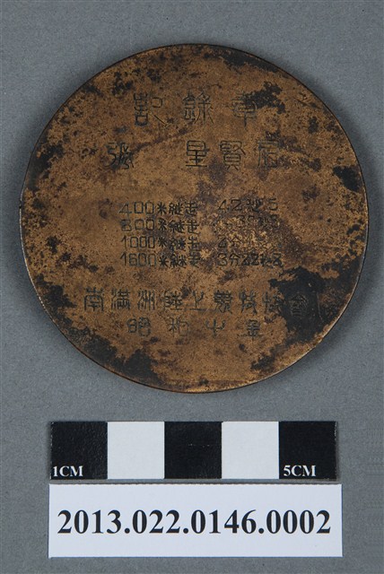 1. 昭和十年南滿洲陸上競技協會記錄章為壓鑄法製成,呈扁平的圓形,雙面,獎牌以浮雕、陰刻技法為主。獎牌正反面皆有些許磨損和刮痕,也有明顯的氧化痕跡。獎牌正面浮雕一名手持盾牌與長槍,頭戴鋼盔,身著吊帶護甲,單膝跪坐的男子。男子頭微微仰起,雙眼凝視前方,下顎繃緊的姿態雕刻地十分細膩;身體細節以多有表現,如手臂的肌肉線條、腿部衣物的皺褶等。左手持一長型盾牌,盾牌上方呈「山」字形,盾牌上陽刻三字:「紀念章」。記錄章背面以陰刻文字為主,上至下、左至右書:「記錄章」、「張星賢君」、「400米繼走42秒5」、「800米繼走1分30秒3」、「1000米繼走2分1秒8」、「1600米繼走3分22秒8」、「南滿洲陸上競技協會」、「昭和十年」。昭和十年即1935年,獎牌上為當時張星賢所參與的競技項目以及成績。2. 1932年日本政府在中國東北成立傀儡政權——滿洲國,表面上由清朝末代皇帝溥儀執政,實為日本的殖民地。本件作品的滿洲以及撫順炭鐵,都呼應了當時日本經營滿洲國的歷史。本件作品由張昭平先生捐贈張星賢先生的體育文物,而本件作品對張星賢先生有密切的關聯和回憶。張星賢自早稻田大學畢業後,考取南滿洲鐵道株式會社的職員,並於滿鐵時期參加許多比賽,多次獲得好成績。