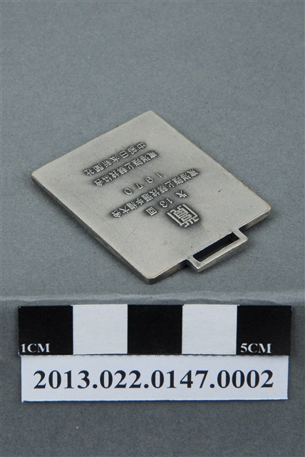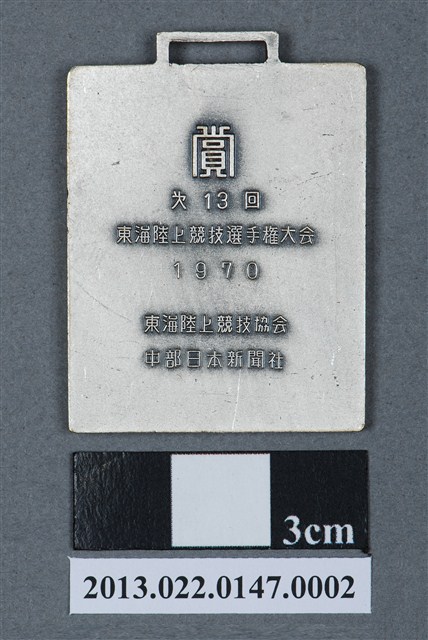 1. 第13回東海陸上競技選手權大會紀念獎牌為壓鑄法製成,呈扁平的長方形,雙面,上方有一凸起的長方形環,應為懸掛作用。獎牌以浮雕、陽刻技法為主。獎牌反面有些許刮痕和孔洞,且邊緣的磨損較嚴重,但整體保存良好、完整。獎牌正面浮雕一人像,以古希臘雕塑作品《擲鐵餅者》為靈感,高浮雕手執鐵餅的全裸人像。人像頭髮鬈曲,深目高鼻,體格健壯厚實,浮雕著重於肌肉紋理的刻畫,但並未仔細處理細節。臉部、手指以及腳掌處的刻畫略顯不足,但整體姿態生動,比例適中。男子站於一平台上方,平台側面雕有「T.R.K.」字樣,右側則有一飄揚的日本國旗旗幟,旗幟上色。獎牌背面則陽刻筆畫纖細的文字,由左至右、上至下書:「賞」、「第13回」、「東海陸上競技選手權大會」、「1970」、「東海陸上競技協會」、「中部日本新聞社」。2. 東海是日本區域劃分之一地帶,包含愛知縣在內,因此東海陸上競技選手權大會便是在日本愛知縣名古屋舉辦的田徑賽事,為區域型的運動賽事。第13回舉辦於1970年,如獎牌上所示。本組作品為張星賢先生舊藏,張星賢曾在日本早稻田大學留學,並參與兩次奧運,退役後提拔了許多優秀的臺灣田徑選手。而張星賢先生與名古屋中京大學的關係十分友好密切,因此也將許多臺灣選手送至中京大學遊學、訓練。