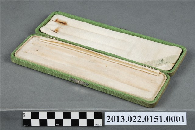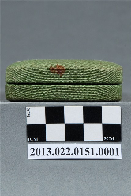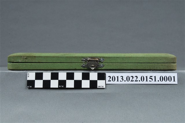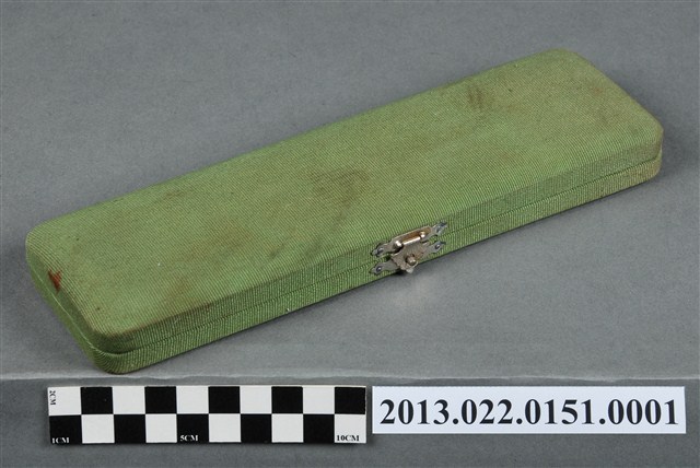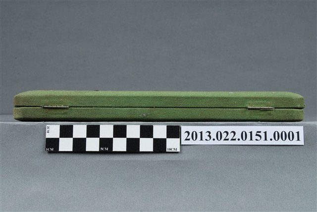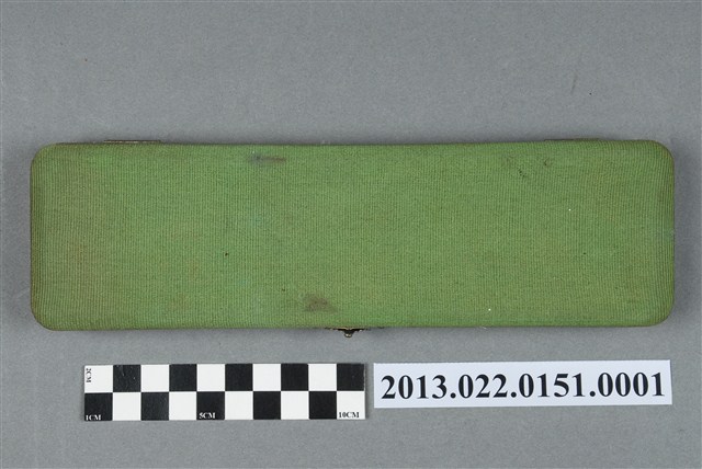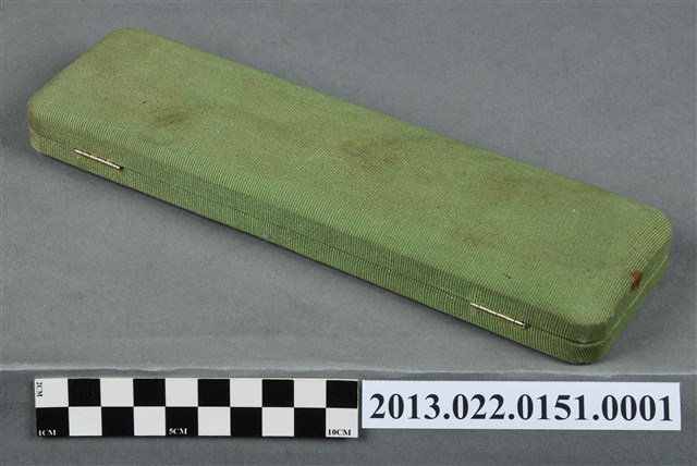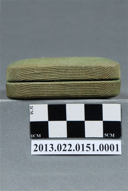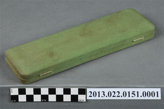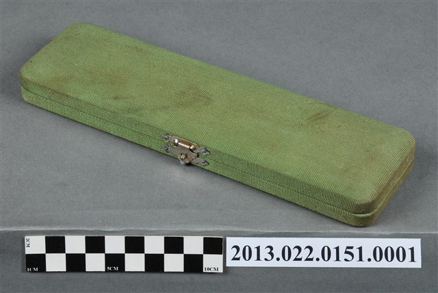 1.本物件為張星賢使用之沾水筆外盒,材質為布質,顏色為綠色。外盒開口處有金屬製扣環,整體外表有多處汙跡與磨損現象。