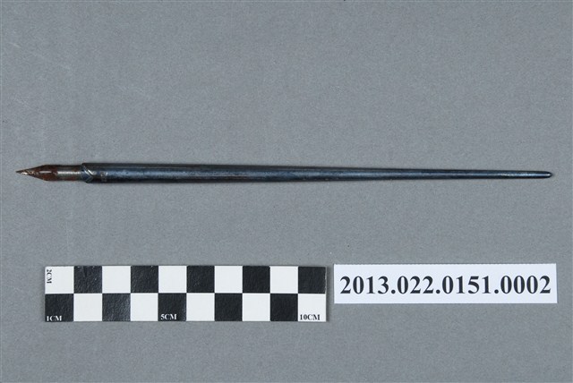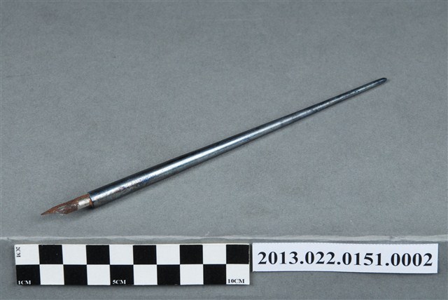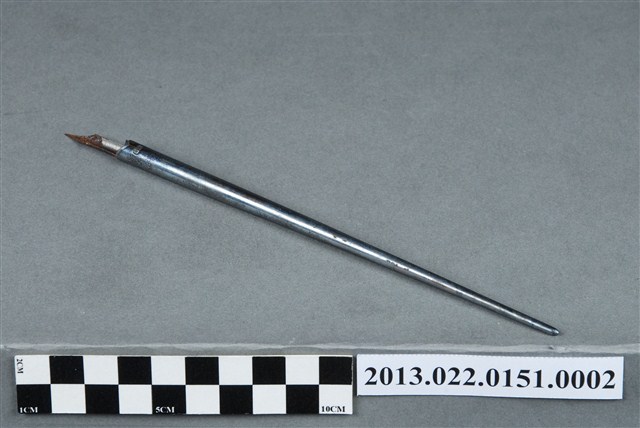 1.本物件為張星賢使用之沾水筆,筆尖材質為金屬,筆管前端直徑較大,後端直徑較小,筆尖有鏽蝕現象。沾水筆是用筆尖沾上墨水然後書寫或繪畫,需使用瓶裝墨水。