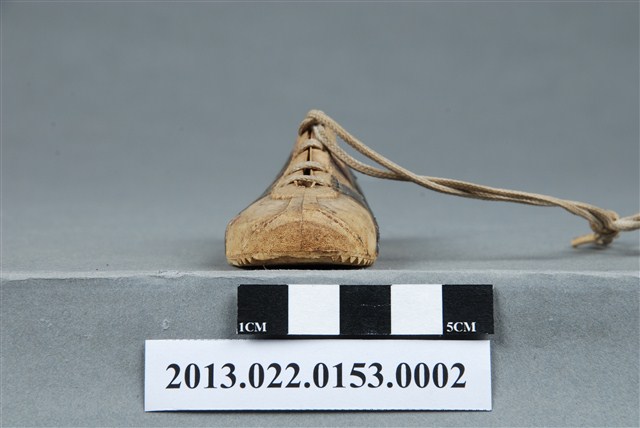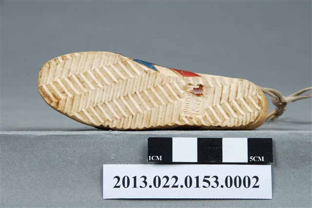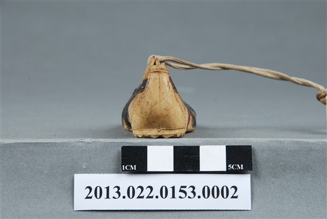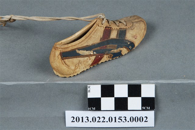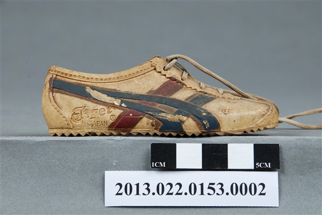 本件為楊傳廣贈張星賢紀念白底紅藍條紋運動鞋一雙部件之二,長約9.4公分、寬約3.2公分、高約3.2公分。由塑膠皮製成,綁有鞋帶,鞋面和鞋身以白色為底,兩側紅藍條紋配色為經典款MEXICO 66鞋款的配色,後踵外側處印有「Tiger®」商標及「JAPAN」字樣。鞋底為白色塑膠製成,壓印交錯的斜條紋,近鞋跟處印有「Onitsuka Tiger®」商標,商標上有一紅色記號。從鞋身兩側的條紋顏色剝落、白底泛黃,以及後跟護套處的褐色汙漬等部分,可以看出此鞋經過使用的歷史痕跡。