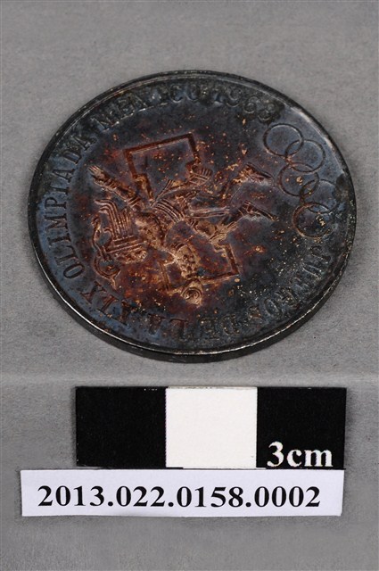 2. 本件為1968年墨西哥奧林匹克運動會紀念幣,有嚴重氧化痕跡。硬幣正面有墨西哥城建城神話的老鷹咬著蛇,站立於仙人掌樹上之圖,背面則是源自於西班牙的派洛塔(Pelota)球選手,立於場中,腳下還有奧運之環。環繞選手的銘文為「JUEGOS DE LA XIX OLIMPIADA MEXICO 1968」,意思是第19屆夏季奧運於墨西哥1968。