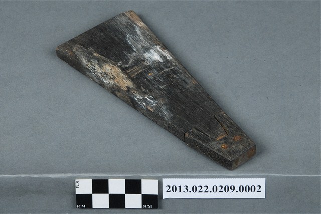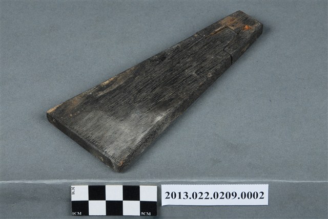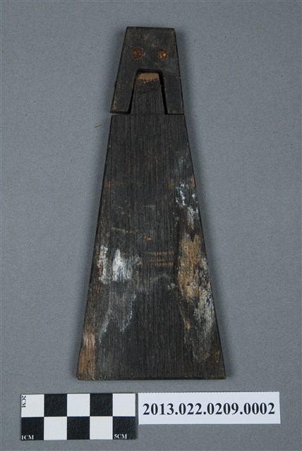 1. 本件為張星賢選手東台運動會紀念牌之支架,由十位臺灣同胞共同製作贈予張星賢先生,後由其四子張昭平先生捐贈給臺灣歷史博物館。支撐架外觀呈上窄下寬的梯形,由一凹一凸兩塊木板嵌合組成,相接處設有活動卡榫,原本應釘於紀念牌背後將其立起展示,表面髹黑漆,下半段有些許漆剝落,呈白色或露出木頭原色。2. 張星賢(1910-1989)為臺灣田徑選手,出生於初生於日治時期的臺中廳,1932年代表日本參與洛杉磯奧運,為臺灣首位奧運選手,1948年回臺灣創立田徑協會,擔任首屆臺灣省田徑協會會長,並擔任總幹事達二十餘年,以教練身份培訓、指導新一代臺灣田徑選手,例如陳英郎、楊傳廣、紀政等人。"