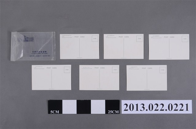 1.臺灣省議會發行議會建築景觀明信片組,內含1件明信片封套與6張印有臺灣省議會建築景觀的明信片,共計1組7件。整體呈橫式設計,封套正面右上角印議事大樓的正立面線描圖,左下角印有「台灣省議會敬贈」與英文「WITH THE COMPLIMENTS OF THE TAIWAN ?(磨損消失,應為P)ROVINCIAL ASS?(磨損消失,應為E)MBLY」。明信片所印照片亦皆為橫式照片,照片上的建築景觀分別有臺灣省議會的議事大樓、朝琴圖書館、議員會館、花園、議事堂。明信片另一書寫面格式皆相同,中央上方印有英文字「POST CARD」,文字下有一分隔直線,可分格書寫收件人地址資訊與信件內容;右上方有一印有「STAMP」的方框,用以貼上郵票;左上方為該張明信片照片之中英文名稱。2.臺灣省議會建築群位於臺中市霧峰區,建築主要有3棟,分別是臺灣省議會議事大樓(1958年竣工)、朝琴館(1963年竣工)、議員會館(前棟於1958年竣工,1966年後棟增建完成),現為臺中市市定古蹟。1949年,中華民國政府遷臺,首都定為臺北市,中央機構設於臺北,形成省政府與中央機關轄區重疊的狀況。為將中央機關與地方政府區隔,政府採用空間移動的方式,將屬於地方機構的省政府遷移至臺灣中部地區。1958年,臨時省議會(臺灣省議會的前身)遷移至臺中霧峰。隔年,行政院以行政命令將臨時省議會改組為臺灣省議會。1998年實施精省後,省議會改成立為臺灣省諮議會。2018年,省諮議會因預算歸零與去任務化的政策正式廢除,原址改為臺灣省議會紀念園區,並於2019年更名為立法院民主議政園區。