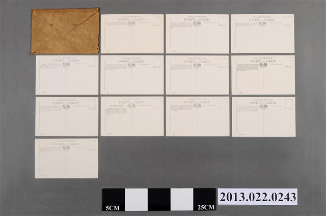 1.布萊恩吉羅德繪英國倫敦風景明信片組,內含1件紙質明信片封套與12張彩繪英國倫敦風景名勝的明信片,共計1組13件。12張明信片皆為橫式版面設計,每張皆有彩色滿版圖繪,圖繪主題分別是倫敦白廳皇家騎兵交接儀式、國會大廈、西敏聖彼得協同教堂、和平紀念碑與白廳、聖保羅大教堂、皮卡迪利圓環、皇家砲兵紀念碑、牛津街、特拉法加廣場、國會廣場、攝政街、維多利亞女王紀念碑與白金漢宮。圖繪原作者是布萊恩吉羅德(Brian Gerald),原圖以水彩創作,明信片發行商則是華倫泰父子有限公司(Valentine & Sons Ltd.)。明信片另一書寫面印刷格式皆相同,中央上方印有「VALENTINE’S POST CARD」字樣與地球圖案商標。文字下方有一分隔直線,分隔線右方有「FOR ADDRESS ONLY」之提示,可書寫收件地址資訊於下方空白處;分隔線左方有圖繪的簡介,左方邊緣為華倫泰公司著作權標示。右上方印有方框,為郵票黏貼處。2.本套明信片的出版商華倫泰父子有限公司(Valentine and Sons, Ltd.)在1825年於蘇格蘭的丹地(Dundee)創立,是一家印刷與攝影公司。該公司的創建者是約翰華倫泰(John Valentine),其子詹姆斯華倫泰(James Valentine,1815-1879)是蘇格蘭知名的攝影師。1860年代,因應日益繁盛的旅遊活動,華倫泰父子公司開始將詹姆斯的攝影作品製作成印刷版畫販售。至1890年代,華倫泰公司已有超過40,000張拍攝世界各地旅遊景點的攝影底片。在詹姆斯過世後,華倫泰家族第三代威廉(William Dobson Valentine,1844-1907)與喬治(George Valentine,1852-1890)接掌公司,同時迎來了公司的轉機。1896年,華倫泰父子公司開始將這些攝影作品製作成明信片販售並獲得成功,成為了蘇格蘭首屈一指的照片明信片製造商。在1900年代,明信片熱潮在世界沸騰之時,華倫泰父子公司更是擴大規模經營,與許多藝術家和攝影師合作,在英國、加拿大、美國、澳大利亞和南非等地發行明信片。儘管後期明信片搜集熱潮消退,該公司仍生產明信片至1960至1970年代。