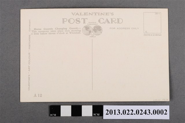 1. 白廳皇家騎兵交接儀式,橫式水彩圖繪明信片,為華倫泰父子有限公司(Valentine and Sons, Ltd.)發行的「倫敦系列1」明信片組、一套12張明信片之其中一張。明信片正面圖片為布萊恩吉羅德(Brian Gerald)的水彩作品,圖繪內容是英國倫敦白廳皇家騎兵交接儀式舉行的場景,畫面左右兩側各有一整齊列隊的騎兵,駿馬和騎兵皆顯出優雅而挺拔的儀態。圖繪左方下緣附有圖繪名稱「THE CHANGING OF THE GUARD WHITEHALL, LONDON」。明信片背面之書寫面中央上方印有「VALENTINE’S POST CARD」字樣與地球圖案標誌,商標上下兩端寫有英文字「FAMOUS THROUGHOUT THE WORLD」。文字下方有一分隔直線,分隔線右方有「FOR ADDRESS ONLY」之提示,可書寫收件地址資訊於右方空白處;分隔線左方有圖繪的簡介,左方邊緣為華倫泰公司著作權標示。右上方印有方框,為郵票黏貼處。2. 本件明信片書寫面左上方所附之圖繪簡介「Horse Guards Changing Guard.-This ceremony takes place each morning a little before eleven o’clock at Whitehall.」,說明本件所繪的英國倫敦白廳前的皇家騎兵交接儀式舉行的時間約為每日上午11點鐘。3. 蘇格蘭丹地(Dundee)創立的印刷公司華倫泰父子有限公司(Valentine and Sons, Ltd.)創立於1825年,創建者是約翰華倫泰(John Valentine),第二代經營者詹姆斯華倫泰(James Valentine,1815-1879)則是一名攝影師。華倫泰公司的繁盛,源自於詹姆斯開始將自身的攝影作品複製印刷並大量販售。不過,第三代的經營者威廉(William Dobson Valentine,1844-1907)與喬治(George Valentine,1852-1890)則是擴大公司規模的推手。1896年,華倫泰父子公司開始將攝影作品製作成明信片販售,而明信片商品讓華倫泰公司成為了蘇格蘭首屈一指的照片明信片製造商。在1900年代,明信片熱潮在世界沸騰之時,華倫泰父子公司更是擴大規模經營,與許多藝術家和攝影師合作,在英國、加拿大、美國、澳大利亞和南非等地發行明信片。儘管明信片搜集熱潮已逐漸消退,但該公司仍生產明信片至1960至1970年代。