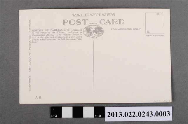 1. 國會大廈,橫式水彩圖繪明信片,為華倫泰父子有限公司(Valentine and Sons, Ltd.)發行的「倫敦系列1」明信片組、一套12張明信片之其中一張。明信片正面圖片為布萊恩吉羅德(Brian Gerald)的水彩作品,圖繪內容是英國倫敦從泰唔士河畔看向英國國會大廈的美景。泰唔士河上有乘坐小舟的遊客,河面波光粼粼,倒映出天空的陽光和遠方宏偉建築——國會大廈。圖繪右上角附有圖繪名稱「HOUSE OF PARLIAMENT, LONDON」。明信片背面之書寫面中央上方印有「VALENTINE’S POST CARD」字樣與地球圖案標誌,商標上下兩端寫有英文字「FAMOUS THROUGHOUT THE WORLD」。文字下方有一分隔直線,分隔線右方有「FOR ADDRESS ONLY」之提示,可書寫收件地址資訊於右方空白處;分隔線左方有圖繪的簡介,左方邊緣為華倫泰公司著作權標示。右上方印有方框,為郵票黏貼處。2. 本件明信片背面所附之圖繪簡介寫有「HOUSE OF PARLIAMENT-Situated on the banks of the Thames, and close to Westminster Abbey. The Victoria Tower is seen on the left, and on the right is the Clock Tower, which contains the bell known as “Big Ben.”」,介紹本件國會大廈建築座落泰晤士河畔,與西敏聖彼得協同教堂相鄰。畫面上左側是維多利亞塔,右側鐘樓則是「大笨鐘」。3. 國會大廈是英國國會所在地點,是1840年在中世紀重要遺址上重建的建築,1987年被列為世界遺產,為哥德復興式建築樣式的典範之一。本件明信片畫面左方所繪的維多利亞塔,是建築群裡數座塔樓中最高的一座,而畫面右方(實際位在建築北端)的鐘樓則是最知名的「大笨鐘」(Big Ben,2012年,為慶祝伊莉莎白二世登基60年,大笨鐘更名為伊莉莎白塔Elizabeth Tower),為世界公認之英國與倫敦的象徵。