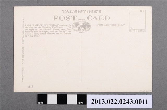 1. 國會廣場,橫式水彩圖繪明信片,為華倫泰父子有限公司(Valentine and Sons, Ltd.)發行的「倫敦系列1」明信片組、一套12張明信片之其中一張。明信片正面圖片為布萊恩吉羅德(Brian Gerald)的水彩作品,圖繪內容是英國倫敦英國國會大廈廣場前的美景。前景是汽車、腳踏車、雙層巴士環繞的方形綠地廣場,廣場後方則是壯觀的國會大廈,畫面左側即是英國倫敦的象徵地標「大笨鐘」。圖繪下緣左側附有圖繪名稱「PARLIAMENT SQUARE, LONDON」。明信片背面之書寫面中央上方印有「VALENTINE’S POST CARD」字樣與地球圖案標誌,商標上下兩端寫有英文字「FAMOUS THROUGHOUT THE WORLD」。文字下方有一分隔直線,分隔線右方有「FOR ADDRESS ONLY」之提示,可書寫收件地址資訊於右方空白處;分隔線左方有圖繪的簡介,左方邊緣為華倫泰公司著作權標示。右上方印有方框,為郵票黏貼處。2. 本件明信片背面所附之圖繪簡介寫有「PARLIAMENT SQUARE-Prominent in the view are the House of Parliament. On the right is the Victoria Tower, over four hundred feet in heights, and on the left the Clock Tower, which contains the bell known as “Big Ben.”」,介紹本件明信片圖繪中最顯著的國會大廈建築。畫面右側是高達400英尺的維多利亞塔,左側鐘樓則是知名的「大笨鐘」。3. 國會大廈是英國國會所在地點,是1840年在中世紀重要遺址上重建的建築,1987年被列為世界遺產,為哥德復興式建築樣式的典範之一。本件明信片畫面左方所繪的維多利亞塔,是建築群裡數座塔樓中最高的一座,而畫面右方(實際位在建築北端)的鐘樓則是最知名的「大笨鐘」(Big Ben,2012年,為慶祝伊莉莎白二世登基60年,大笨鐘更名為伊莉莎白塔Elizabeth Tower),為世界公認之英國與倫敦的象徵。
