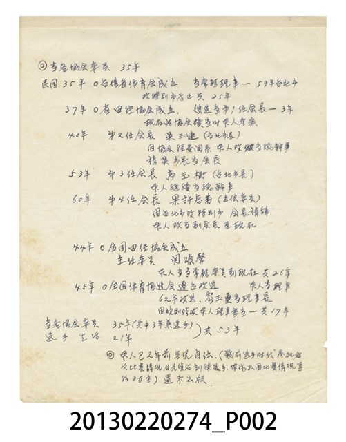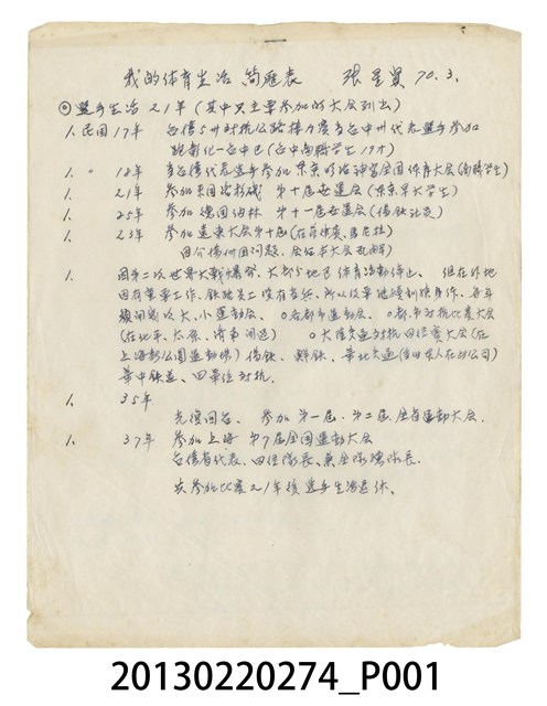 1.本物件為張星賢撰〈我的體育生活五十餘年 〉簡歷表原稿,張星賢於1981年時對於約8萬餘字自傳所做的簡歷表原稿,從中可知從選手生涯(21年)到擔任各體育協會委員(32年)共有53年經歷,也可知自傳完成時間應為1979年。