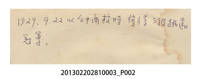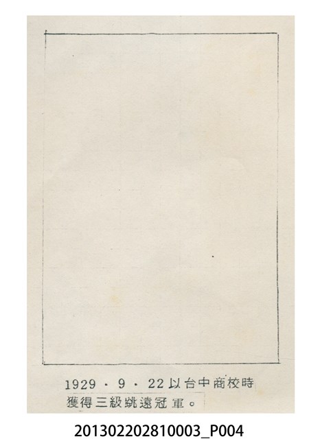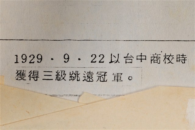 1.本物件為第三回全島中等學校陸上競技會三級跳冠軍照,1929年9月22日張星賢代表臺中商業學校參與「第三回全島中等學校陸上競技會」,獲得三級跳冠軍。該屆比賽他參加5個項目,獲得4個冠軍。