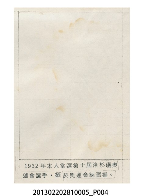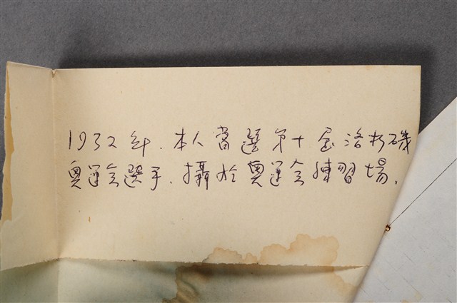 1.本物件為第十屆美國洛杉磯奧運會練習場張星賢獨照,張星賢入選1932年第十屆美國洛杉磯奧運會日本代表隊選手後,在奧運會練習場上的紀念照。