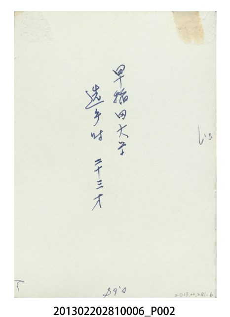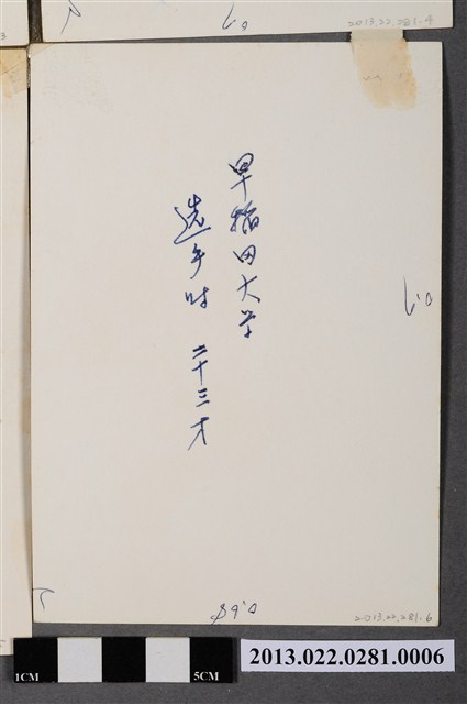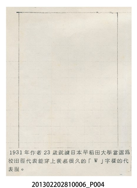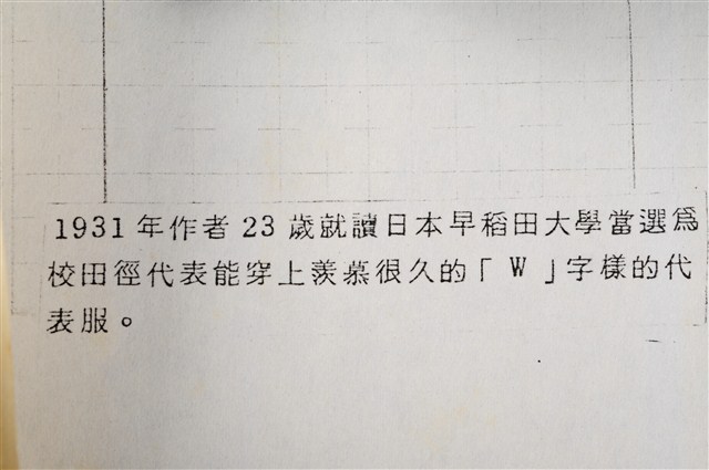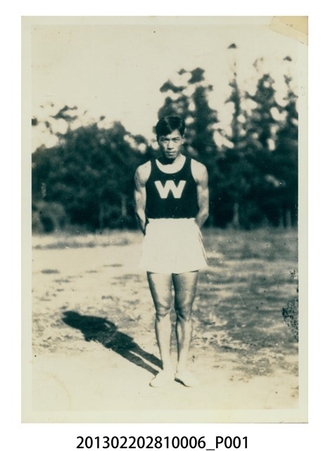 1.本物件為張星賢身穿早稻田大學田徑隊服獨照,1931年張星賢就讀早稻田大學時,被選拔為田徑隊代表,身穿上有「W」標誌的早大田徑隊制服的獨照。