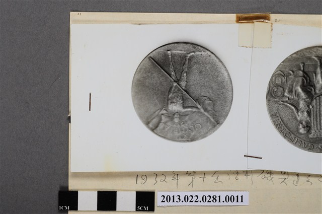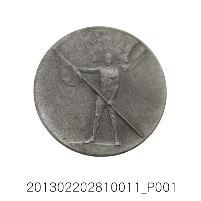 1.本物件為1932年第十屆洛杉磯奧運會選手章正面。徽章刻有雙手持大旗的男性運動員。上刻有"X OLYMPIA 1932"等字樣。