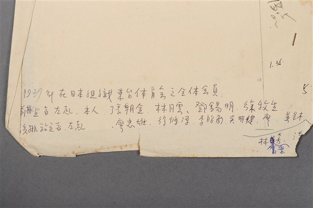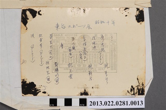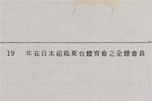 1.本物件為1937年與東臺體育會全體會員合照,前排左起為張星賢,張朝金、林月雲、鄧錫明、徐牧生,後排左起廖忠雄(橄欖球)、徐條源、李皓商(田徑800公尺)、吳明捷(棒球)、廖氏、黃呈木(田徑)、林垂芳(拳擊)、洪氏等人,以上等人皆為著名運動選手。背面則印有「新開聯合社」資訊。