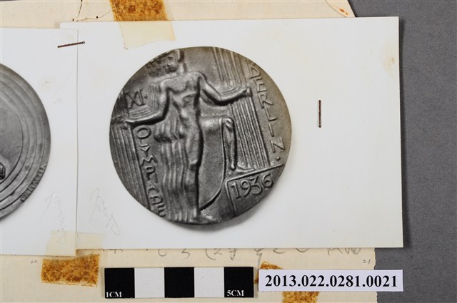 1.本物件為1936年第11屆柏林奧運會選手章正面。徽章上刻有男性運動員形象的浮雕,同時刻有(由右至左)「BERLIN」、「1936」、「ⅩⅠ」、「OLYMPIADE」等字樣。