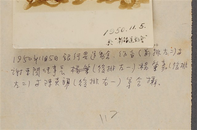 1.本物件為彰銀運動會張星賢等8人合影,1950年11月5日彰銀運動會中,張星賢(前排左二)、謝東閔(後排左一)、楊肇嘉(後排左二)、陳英郎(後排右一)等8人的合照。