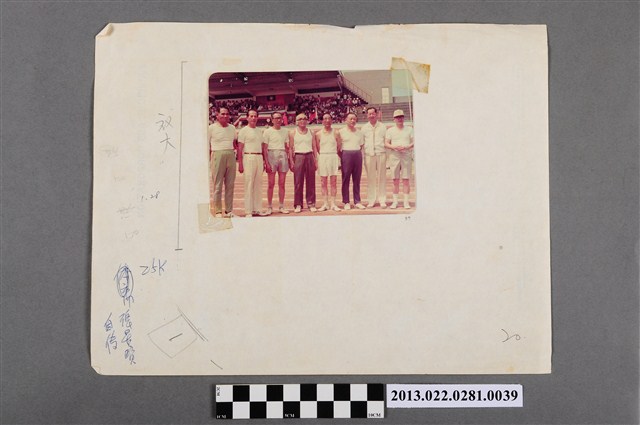 1.本物件為張星賢等8人田徑場合照,張星賢(左三)等8人在田徑場上的合照。