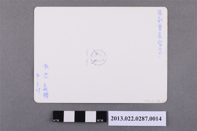 1.本物件為張星賢等9人合影照片,拍攝時間為民國70年6月29日,合影者共9人,張星賢位於左3。拍攝場景為戶外,眾人後方應為水池。張星賢穿著襯衫搭配深色西裝外套,其餘男性友人,穿著短袖上衣、工作服,或襯衫搭配西裝外套;女性友人穿著短袖上衣搭配深色長裙。照片背面書寫「張副會長留念:」、「杜忠義贈」、「70.6.29」。