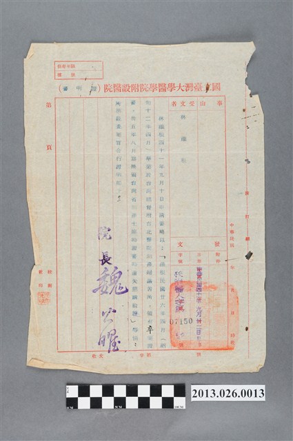 2013.026.0013 1952年臺灣大學醫學院附設醫院發給林添根臺灣總督府臺北醫院助產婦講習所卒業證書之證明公文
