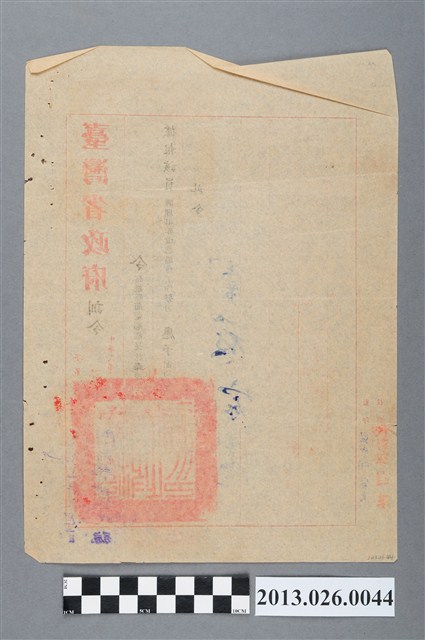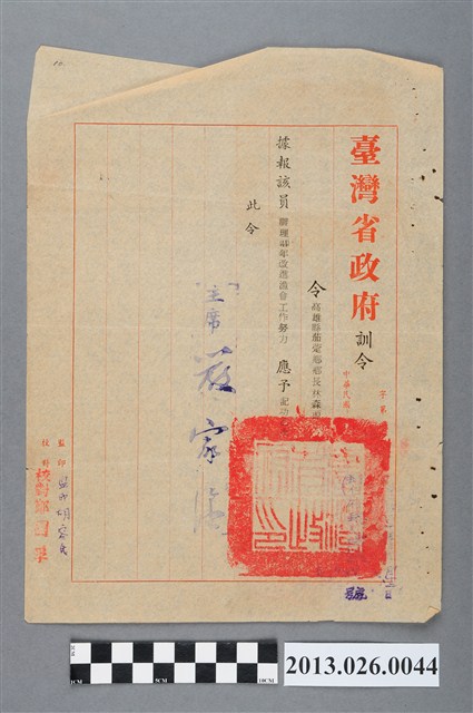 2013.026.0044 1956年臺灣省政府對高雄縣茄萣鄉長林森源因辦理44年改進漁會工作努力記功乙次之訓令