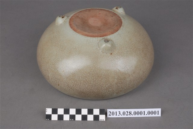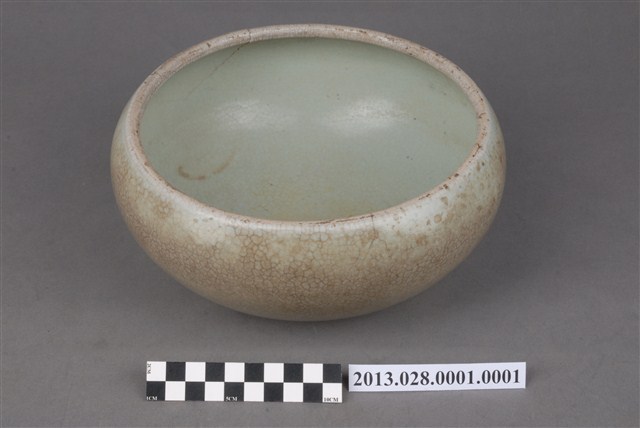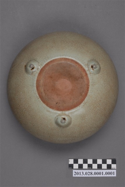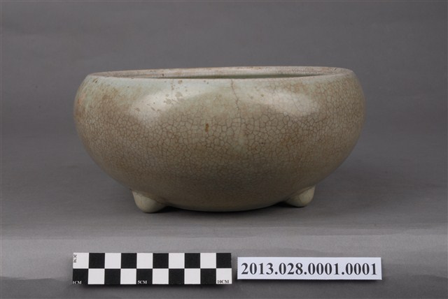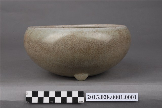2、香爐呈圓弧形,口部平、寬。底部有三個小而圓的突狀器足,用以確保器皿穩固。除器皿底面局部未上釉外,內外均似為天青釉色,釉面密布因胎土與釉料膨脹係數不同而產生的細緻冰裂紋(開片)。