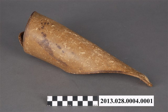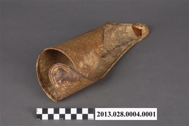 2、本件有三角形皮革材質椅套及金屬椅架各一,併有一布質束口袋。椅套背面有大正拾叁年四月四日字樣,背面三個角均作有小型套口,可分別套入椅架腳後撐起椅套。椅架使用時,以中心點分別向上、向下延伸三枝鐵架,上方三枝鐵架端點分別套上三角形椅套之一角,下方三枝鐵架則透過展開的枝架強固結構而立於地面。收起時則將中心點以上鐵架向下收折即可。
