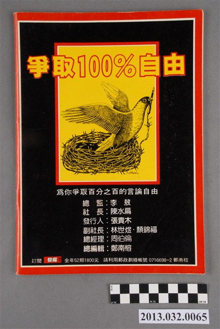 《自由時代》系列雜誌為鄭南榕所創辦,創刊於1984年3月,以「爭取百分之百的言論自由」為主旨,對當時執政黨的嚴密的言論及思想控制多所批判,因而屢遭查扣或停刊。本刊(發揚週刊)時由李敖擔任總監,張貴木任發行人,陳水扁任社長。
