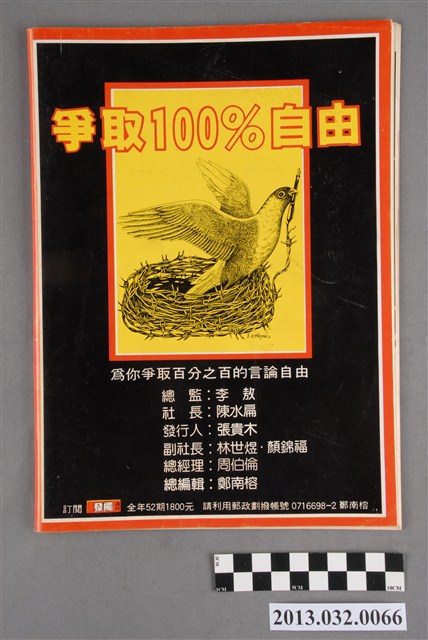 《自由時代》系列雜誌為鄭南榕所創辦,創刊於1984年3月,以「爭取百分之百的言論自由」為主旨,對當時執政黨的嚴密的言論及思想控制多所批判,因而屢遭查扣或停刊。本刊(發揚週刊)時由李敖擔任總監,張貴木任發行人,陳水扁任社長。