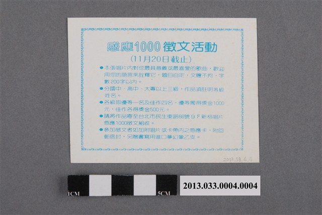 1981年發行,陳志遠編曲。A面有〈匆匆的走過〉、〈月琴〉、〈叩門的人〉、〈戀歌〉、〈請告訴他〉,B面〈告別夕陽〉、〈話別〉、〈雨後的小路〉、〈滑翔翼〉、〈夜星〉。目前館藏未有這張專輯。 活動感應卡為感應1000徵文活動的參加憑據。
