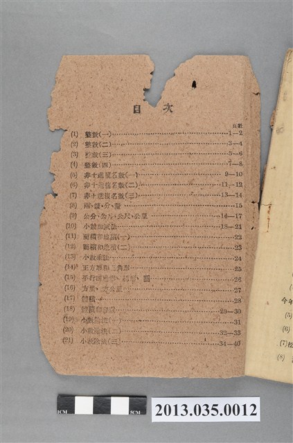 內容有整數,非十進複名數,兩錢分釐,公分公斤公尺公里,小數加減法,面積和地積,小數乘法,正方形和三角形,平行四邊形梯形及圓,方里,方公里,體積,體積和容重,小數除法。
