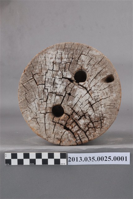 大頭徑木製帽仔模,編織草帽帽頭時所使用的模具,使用時圓頭朝下緊貼編織面,等到編織完成後,上方設有兩指孔洞,可用手指夾出。