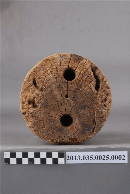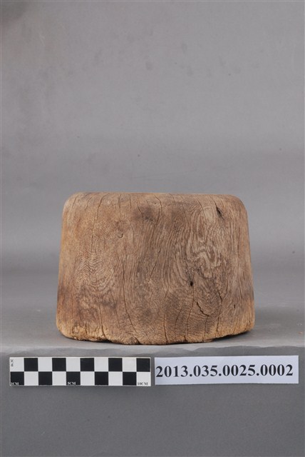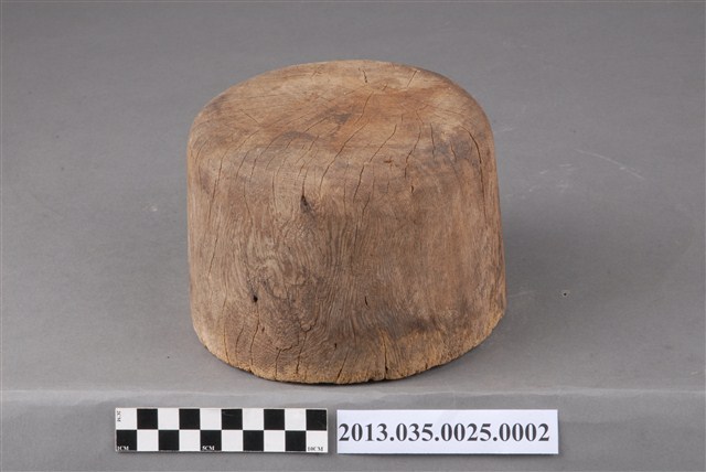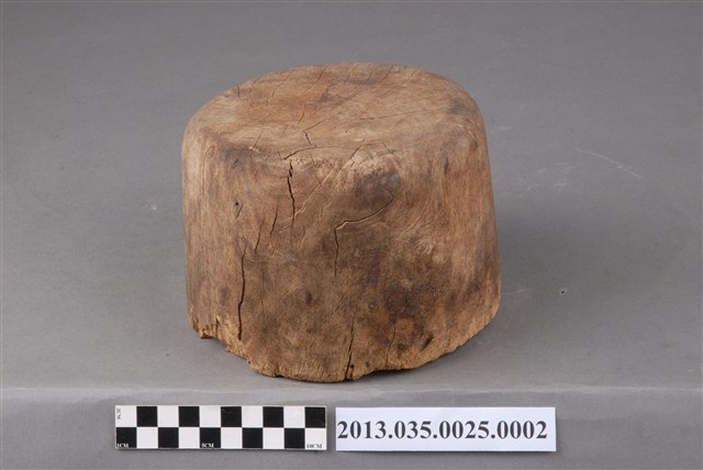 中頭徑木製帽仔模,編織草帽帽頭時所使用的模具,使用時圓頭朝下緊貼編織面,等到編織完成後,上方設有兩指孔洞,可用手指夾出。