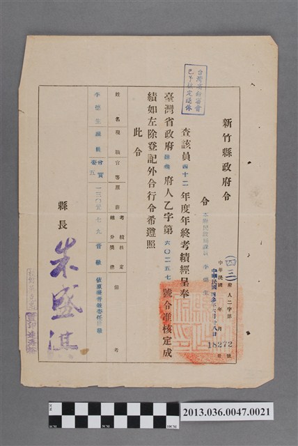 2013.036.0047.0032 新竹縣政府47年度年考考績通知書