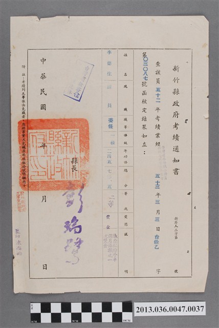 2013.036.0047.0037 新竹縣政府52年考績通知書