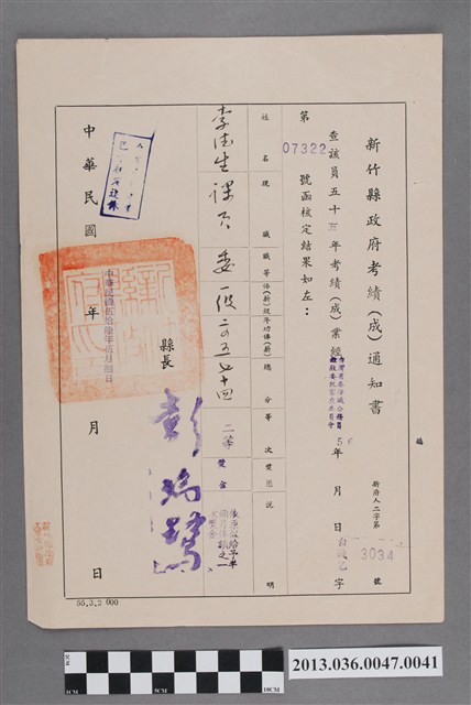 2013.036.0047.0041 新竹縣政府55年考績(成)通知書