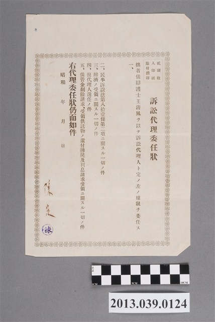 2013.039.0124 昭和年間陳定之訴訟代理委任狀