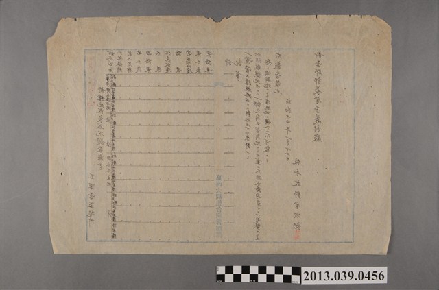 1. 本件為五軍營灌溉監視所技手牧野金次郎,向嘉南大圳組合新營郡部長金子義村報告轄下給水區的特殊地改良狀況的調查。公文文號為「五監第187號」。2. 時間為昭和14年(1939)1月13日,簽收章(「曾文郡部補助部」)時間為和14年(1939)1月16日,簽收人印章不清楚。3. 五軍營監視所下轄給水區為:北鐵線橋、南八老爺、南太泉、西路東、太康、北急水溪、路東、南急水溪、東太康、東路東。4. 依據〈嘉南大圳灌溉地給水區分圖:官田〉,五軍營灌溉監視所屬於官田灌溉區。5. 細部說明:需改良的土地項目,分為「原野及鹽分地」、「魚塭」、「排水不良地」三大項,各項又分為前年末面積、改良面積、殘面積,面積單位為甲。6. 由於並無任何改良數字,推測可能於先前土地改良已經完成。7. 記事原文如下:「一、當館內灌溉地內には耕作せざる原野なし。二、非賦課地內には一部之有も官有地にして重に大排水路兩岸なれば開墾せしも殆と傾斜地にして灌溉地に編入は不可能なり」,大意為「該灌溉監視所轄地內沒有能耕作的荒地;假設將一部分的非賦課地,與作為官有地變成主要的大排水路兩岸的話,它將大部分被整理並成為傾斜地,因此不可能被編入灌溉地內。8. 本件與館藏2013.039.0465、0484、0485、0506、0513、0516為同一脈絡下之土地改良事業報告。(曾祥宇、曾明德撰寫)