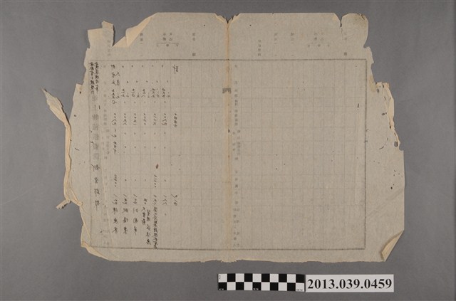 1. 本件為〈查畝營分線堤防並浚渫補修工事地上物補償費調新營郡部〉上半部分,為嘉南大圳組合新營郡部修補查畝營分線時,對於取用土地的地上物補償費調查。2. 調查時間不明,地點為柳營庄太康。但依據內容推測,與館藏2013.039.0454、0455、0460、0461、0462、0463、0466、0467、0478、0515、0518有關,為新營郡部於昭和14年(1939)土地補償調查下的一環。3. 欄位分別為:地名、地番、地目、使用面積、地上物件(種類/收穫見込)、數量、單價、小計、持主又ハ小作人住所氏名。(曾祥宇、曾明德撰寫)