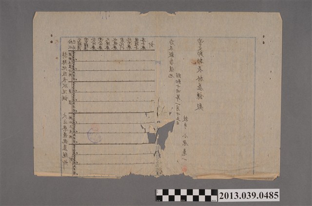 1. 本件為大屯寮灌溉監視所技手小原龜一,向嘉南大圳組合曾文郡部長林益謙報告轄下給水區的特殊地改良狀況的調查。2. 本件發文時間為昭和14年(1939)1月15日,公文文號「大發第3號」;簽收人(印章不清)於昭和14年(1939)1月16日,蓋下簽收章「曾文郡部補助部」。3. 大屯寮監視所下轄給水區為:坔頭港、西坔頭港、北大屯寮、南大屯寮、大埤寮、水波寮、東北門、北西寮、鹽埕子、客子寮。4. 依據〈嘉南大圳灌溉地給水區分圖:下營〉,大屯寮灌溉監視所屬於下營灌溉區。5. 曾文郡守(嘉南大圳曾文郡部長)林益謙,為唯六臺灣人郡守之一。6. 細部說明:需改良的土地項目,分為「原野及鹽分地」、「魚塭」、「排水不良地」三大項,各項又分為前年末面積、改良面積、殘面積,面積單位為甲。7. 由於並無任何改良數字,推測可能於先前土地改良已經完成。8. 本件與館藏2013.039.0456、0465、0484、0506、0513、0516為同一脈絡下之土地改良事業報告。(曾明德撰寫)