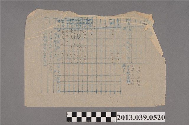 1. 本件為嘉南大圳水利組合〈地上物補償額算出基礎調〉,主題為為嘉義郡部大客線補修工工事。館藏2013.039.0507~0512、0519~0520均為同一脈絡下之檔案。2. 由於嘉義郡水利組合於1943年併入新改組的「嘉南大圳水利組合」(前身為公共埤圳嘉南大圳組合),成為其嘉義郡部,故本件館藏推測為1943~1945年之間。3. 本件欄位為:支出(耕作實費及公課又ハ小作料):I. 縱向有:耕ヨリ組合工事著手迄,分為數量、單價、小計;同上以亦分為數量、單價、小計。II. 橫向則是費目:整地費、種苗費、☐☐/植付費、肥料費、施肥費、中耕/除草費、灌溉/排水費、公課/小作料、支出計。III. 接續上面的欄位,分別是:牛☐付人夫28、三萬本、植付女12人、堆肥1萬斤/水肥百荷、男人(?)人、女人(?)4人、4個月IV. 單價為:3圓、020圓、0.9圓、3圓/0.2圓、1.8圓、0.9圓V. 支出計300.8圓,鉛筆修改為301.6圓。VI. 備考:甲當補償額:甘藍301圓也。大客9則田。4. 本件表格為油印(手刻蠟紙印刷,俗稱刻鋼板)製成。(曾祥宇、曾明德撰寫)