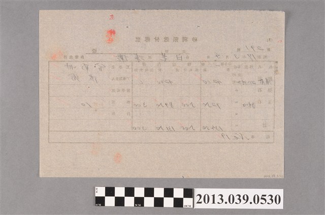 1.此件為「砂利類送付傳票」,編號第291號,記錄昭和17年(1942年)3月4日自白芒至港墘之礫石運送情形,為當時台南州(今嘉義縣)之範圍。2.根據命令第26號(臺史博館藏登錄號:2013.039.0548),共需輸送形質2分至3寸的混合砂利42立坪,以及形質8寸以上的玉石92.5立坪,共計134.5立坪。此傳票當日輸送了形質8寸以上的玉石5立坪,分10車載送,累計已輸送89.5立坪,故送付未濟一欄中,形質8寸以上的玉石尚有3立坪未輸送。(立坪為體積單位,1立方公尺約為0.166375立坪)3.傳票上有主幹福林、作業主任古木等核章。4.記事一欄寫有NO.19之鉛筆字樣。(曾祥宇、莊竣雅撰寫)