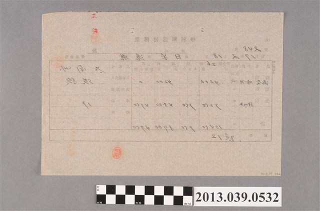 1.此件為「砂利類送付傳票」,編號第248號,記錄昭和17年(1942年)2月18日自白芒至港墘之礫石運送情形,為當時台南州(今嘉義縣)之範圍。2.根據命令第26號(臺史博館藏登錄號:2013.039.0548),共需輸送形質2分至3寸的混合砂利42立坪,以及形質8寸以上的玉石92.5立坪,共計134.5立坪。此傳票當日輸送了形質8寸以上的玉石9.5立坪,分19車載送,累計已輸送45立坪,故送付未濟一欄中,形質8寸以上的玉石尚有47.5立坪未輸送。(立坪為體積單位,1立方公尺約為0.166375立坪)3.傳票上有主幹福林、作業主任古木等核章。4.記事一欄寫有NO.12之鉛筆字樣。(曾祥宇、莊竣雅撰寫)