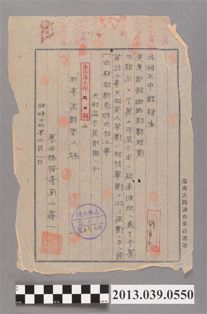 1.此件為〈東石郡部發予理事高橋秀人關於工程預算增額事項公文〉,應與臺史博館藏登錄號2013.039.0499有關,係因后鎮線構造物改修工事中材料單價與預估不同,而由東石郡部長尾山義一,於昭和十四年二月一日向公共埤圳嘉南大圳理事高橋秀人提出預算增額之需求。2.此公文編號為「東石事土第三二號ノ一」,文件下方有紫色的「嘉南大圳14.4.22第276號」戳章。3.文件有文件有15處人名蓋章,其中,文件上方有標註會計係長、用度係長、經理課長、理事、管理者、土木課長、土木事務係長、土木係員等人用印位置。(莊竣雅撰寫)