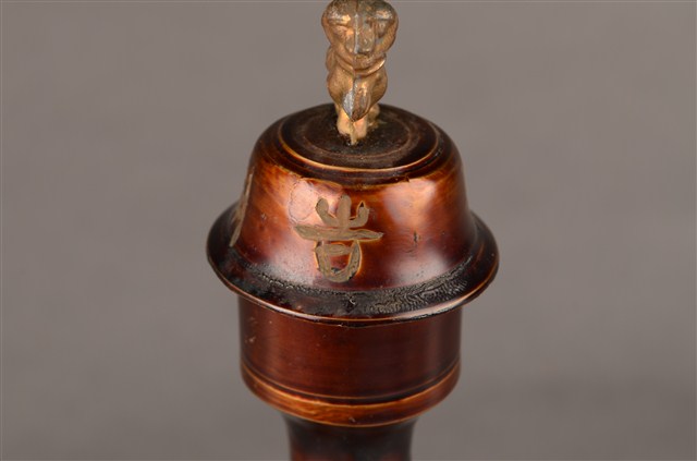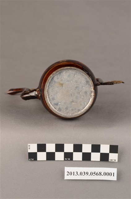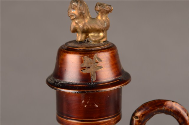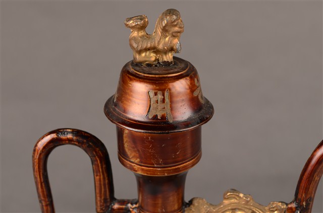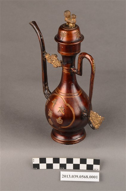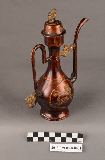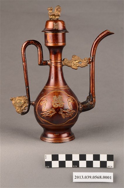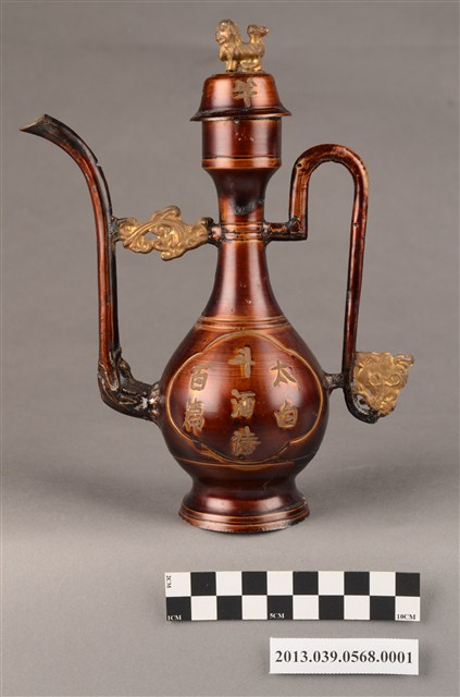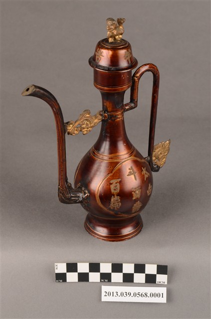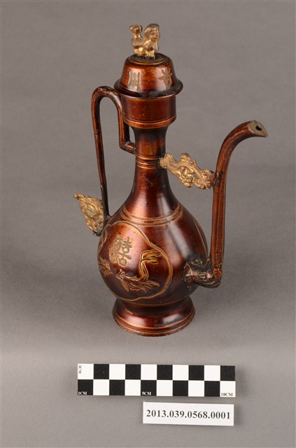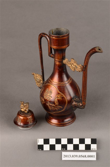 銅製酒壺,上有雙喜字樣,製造年份不詳,日治、戰後均有可能